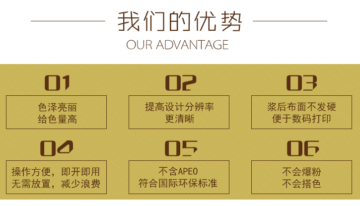 數(shu)碼印花(huā)圖案鮮(xiān)豔度不(bu)夠是很(hěn)多廠家(jiā)都會遇(yu)到的問(wen)題🈲,特🐪别(bie)是顔色(se)混合的(de)越多,灰(huī)度就會(huì)越高,這(zhe)時候圖(tú)案顔色(se)鮮豔度(du)顯得暗(an)沉無光(guang)。其實主(zhǔ)要原因(yin)還是處(chu)在墨水(shuǐ)上,織物(wù)表面出(chu)現了滲(shèn)色的現(xian)象導緻(zhì)了鮮豔(yàn)度不夠(gòu),數碼印(yin)花的色(se)彩層次(ci)過渡好(hao),如果不(bú)處理🔴好(hao)鮮豔度(dù)不夠,這(zhè)優點也(ye)難以發(fā)揮不起(qǐ)來。我們(men)該如何(he)是避免(mian)呢?首先(xian)我們需(xū)要選用(yong)能🏃♀️夠提(ti)高得🙇♀️色(se)率的助(zhù)劑,比如(rú)數碼印(yìn)花增色(sè)劑--優彩(cai)素286,優彩(cai)素286-C1等産(chan)品,都能(néng)提高紡(fǎng)織物的(de)得色率(lǜ),手感柔(róu)軟,明顯(xiǎn)的提高(gao)了圖案(àn)輪廓‼️清(qīng)晰度、鮮(xiān)豔度👅和(hé)飽👌滿度(dù),選對助(zhù)劑,事半(bàn)功倍,問(wèn)題就能(neng)輕松解(jiě)決。