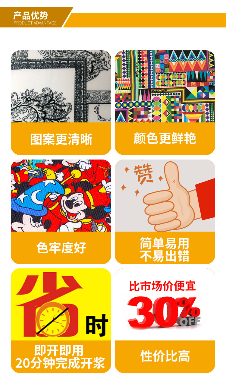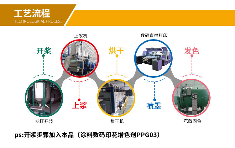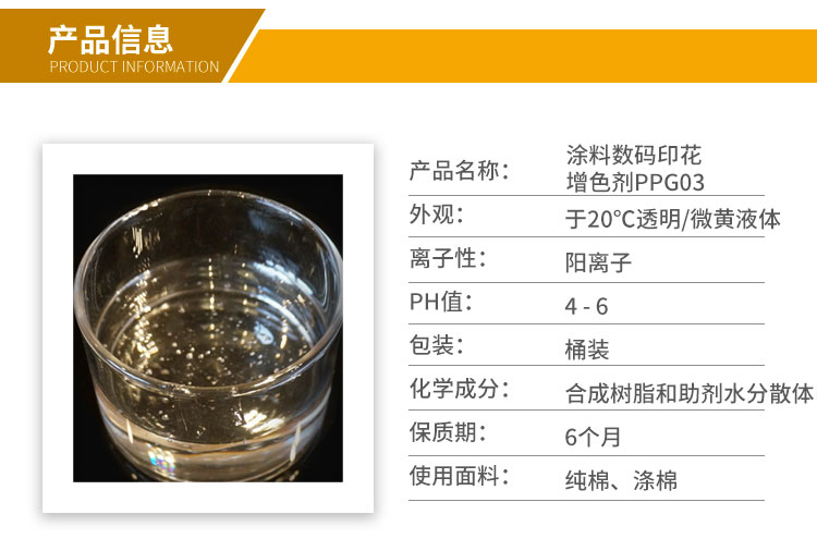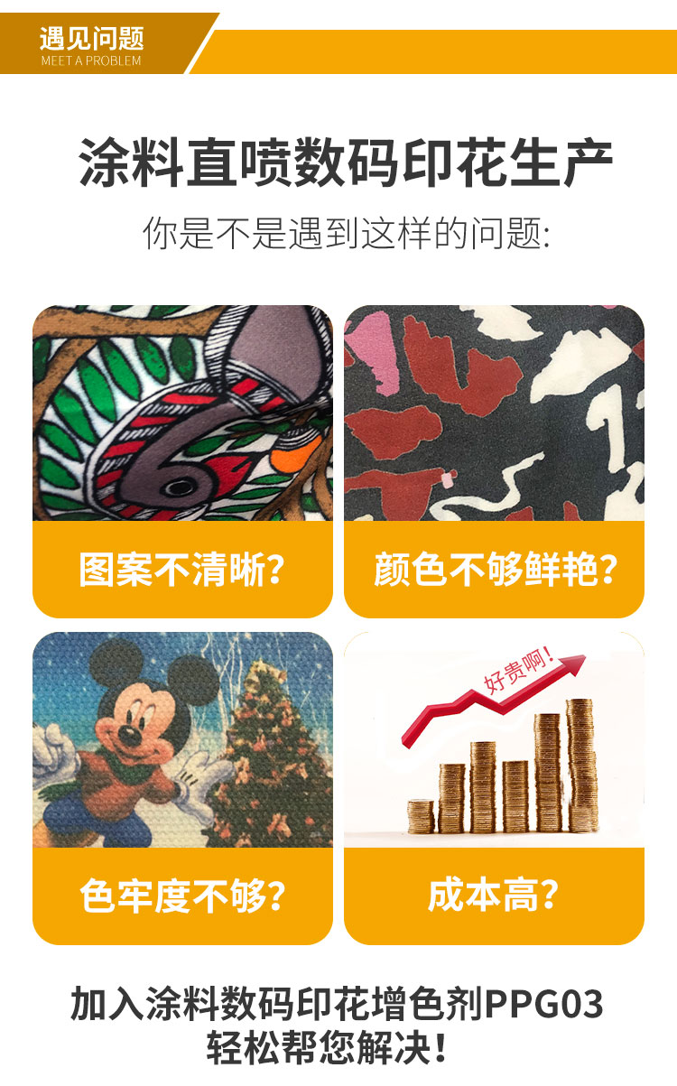 塗料(liào)數碼印花增色劑(ji)PPG03 使用浸軋于面料(liao)上。用量 100- 180 克/升